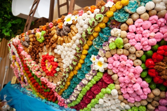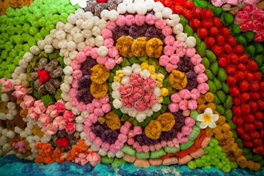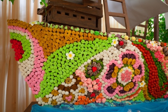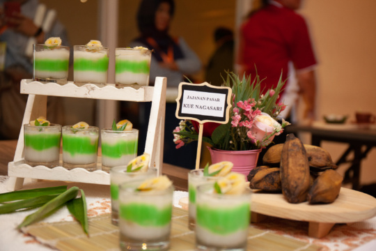 Sementara di area potluck, jajan pasar yang dipajang dalam bentuk kapal layar dikelilingi potluck jajan pasar bawaan para peserta, selesai ditata dan dinyalakan lampu-lampunya.. Taraaaaa…!